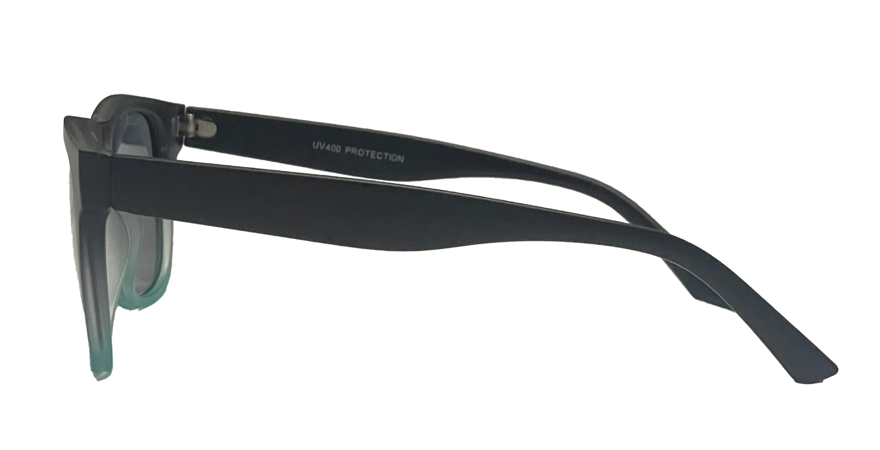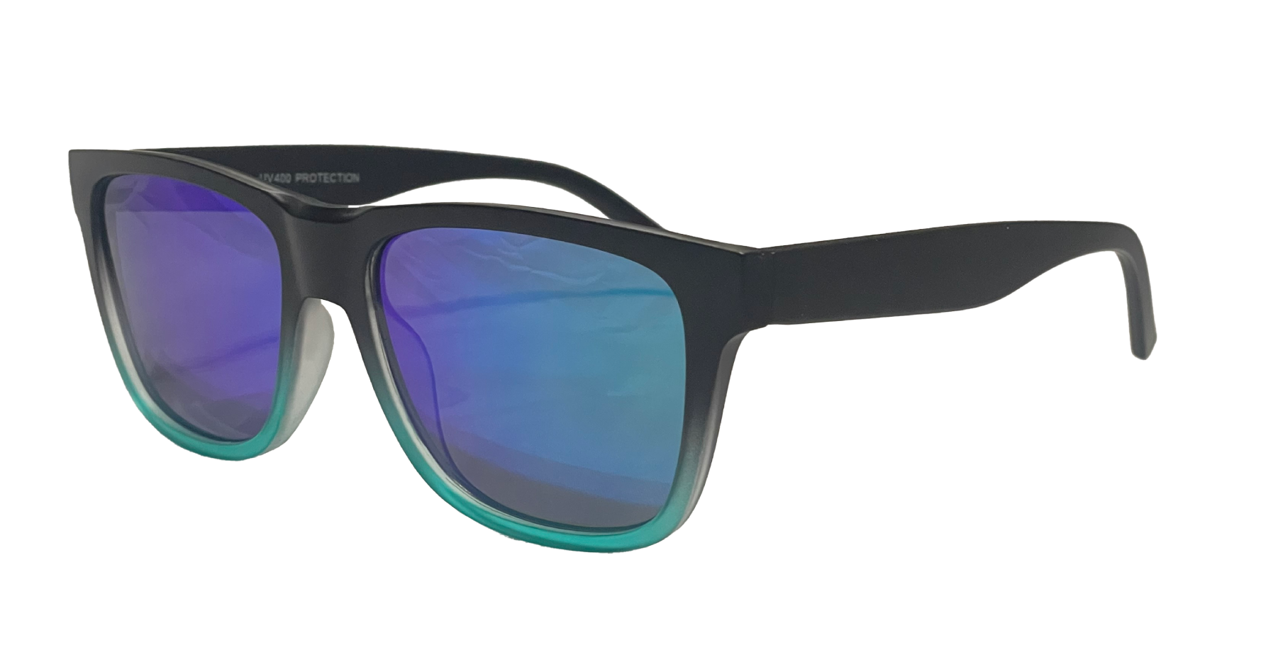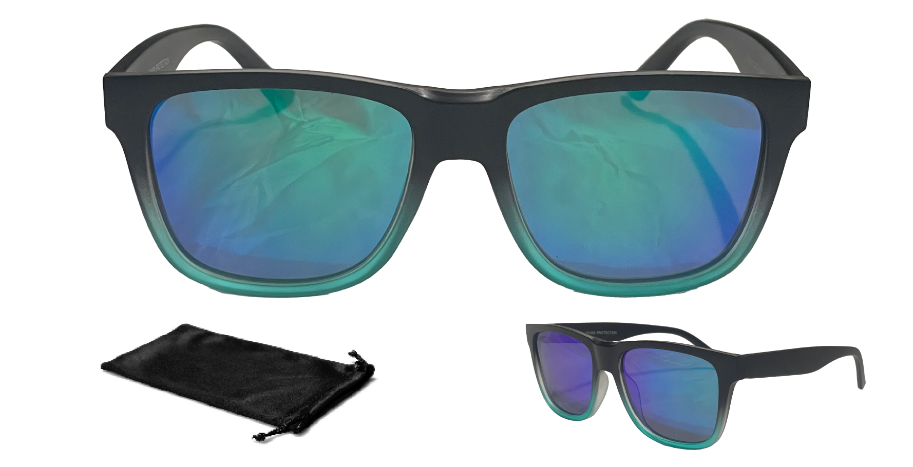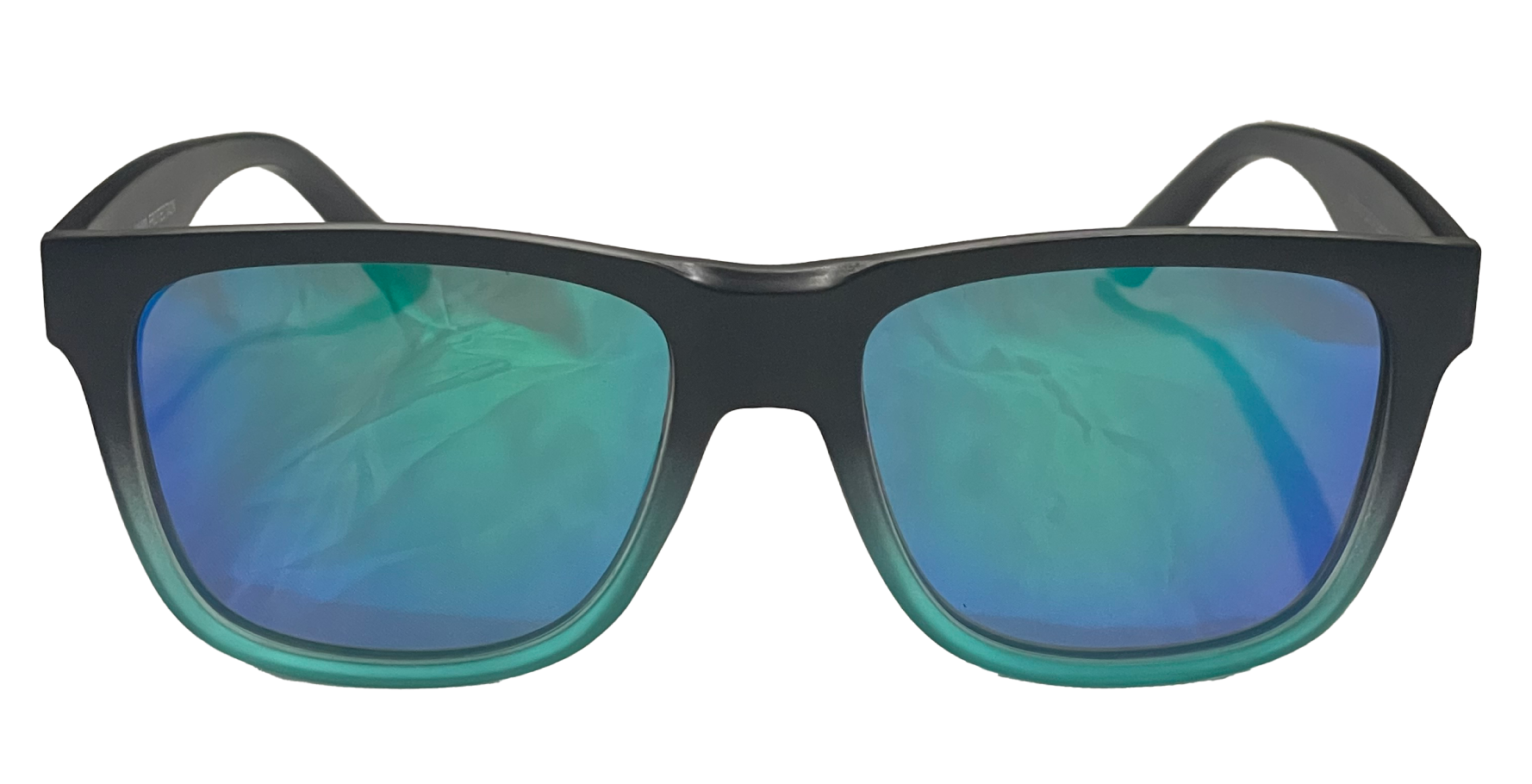 Wayframe w/ blue & black frame and arms, blue/green gradient lenses. This pair comes with a soft microfiber pouch with a double drawstring closure that also acts as a lens cleaner when necessary.