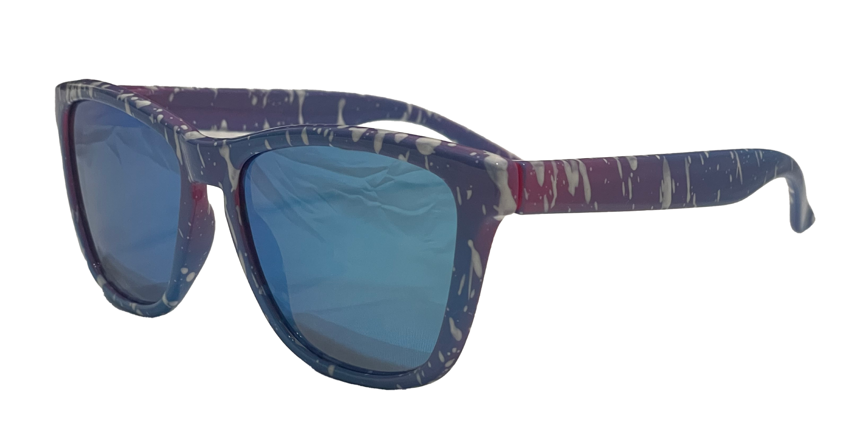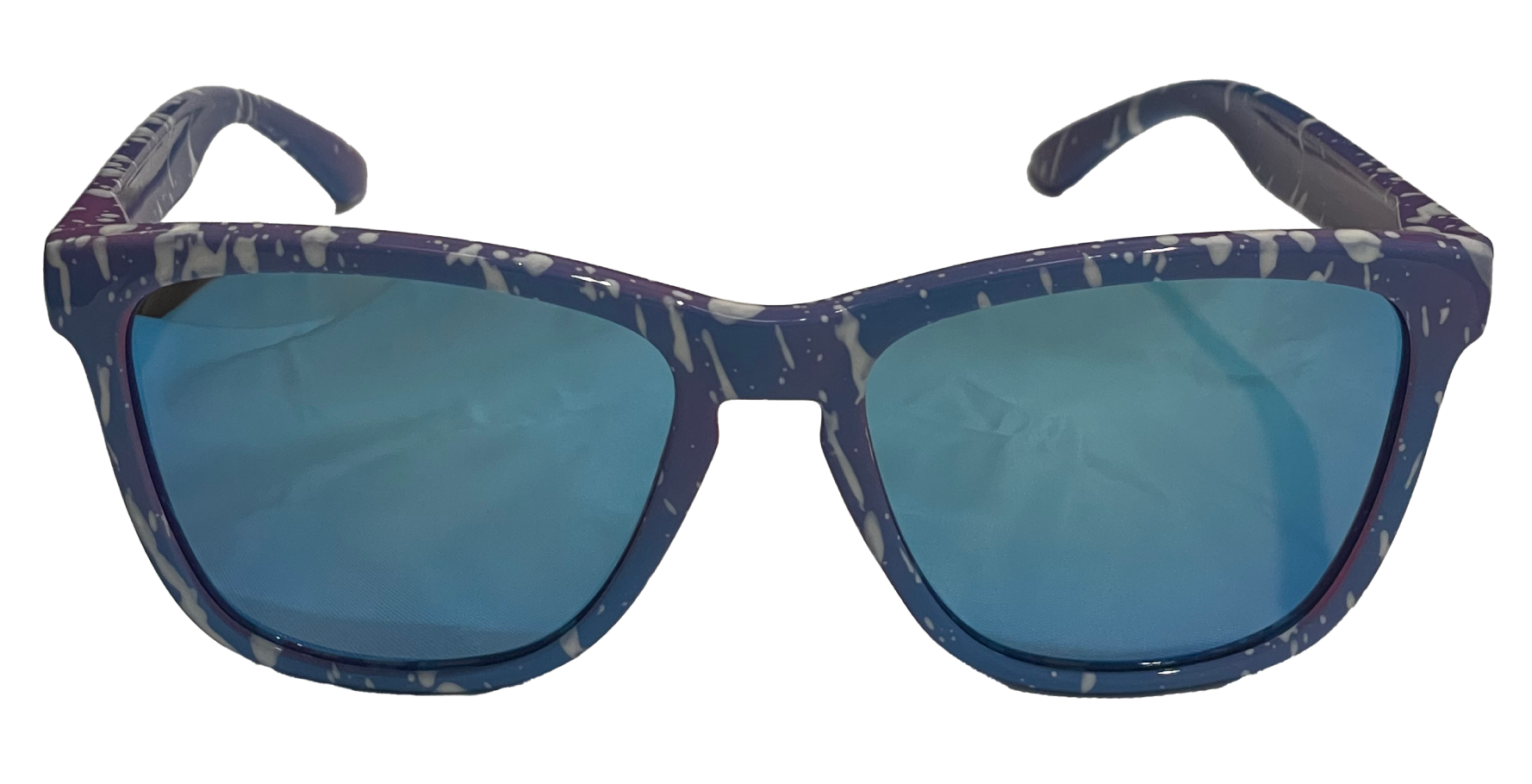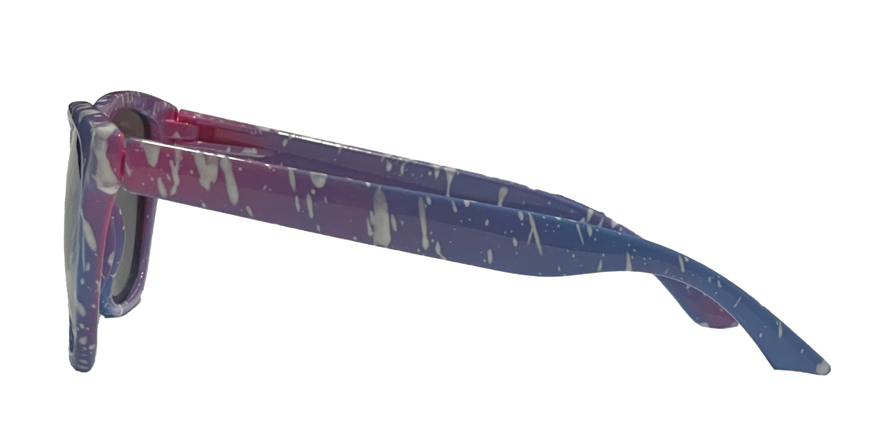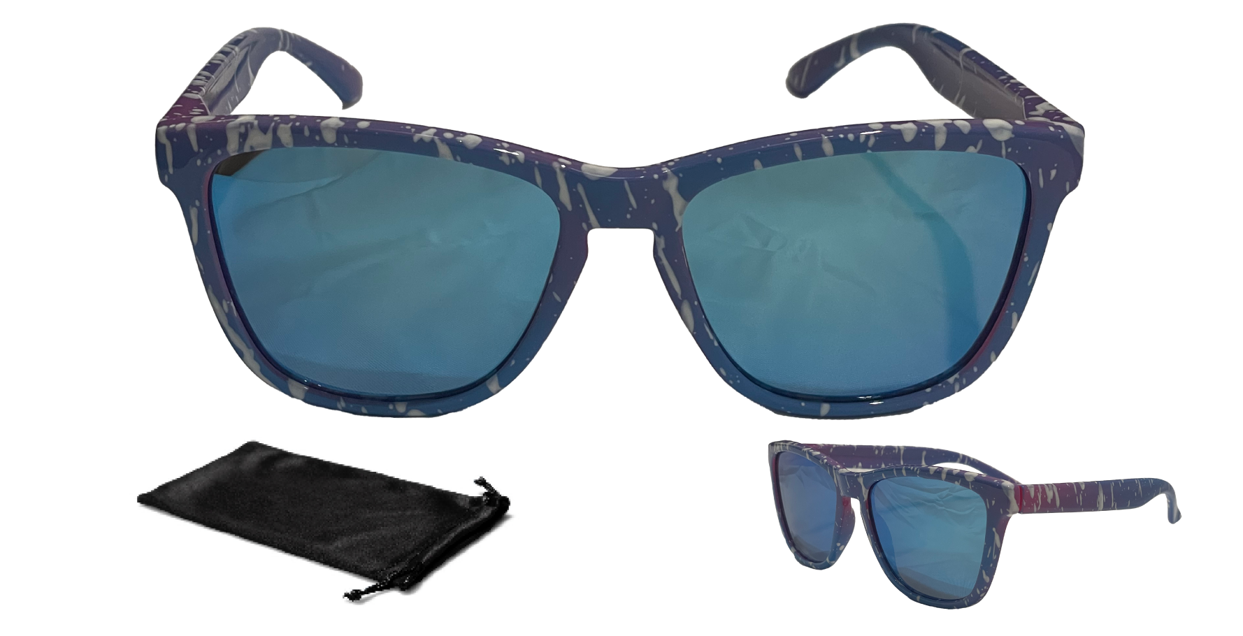 Wayframe w/ blue/pink gradient frame and arms, light blue lenses. This pair comes with a soft microfiber pouch with a double drawstring closure that also acts as a lens cleaner when necessary.