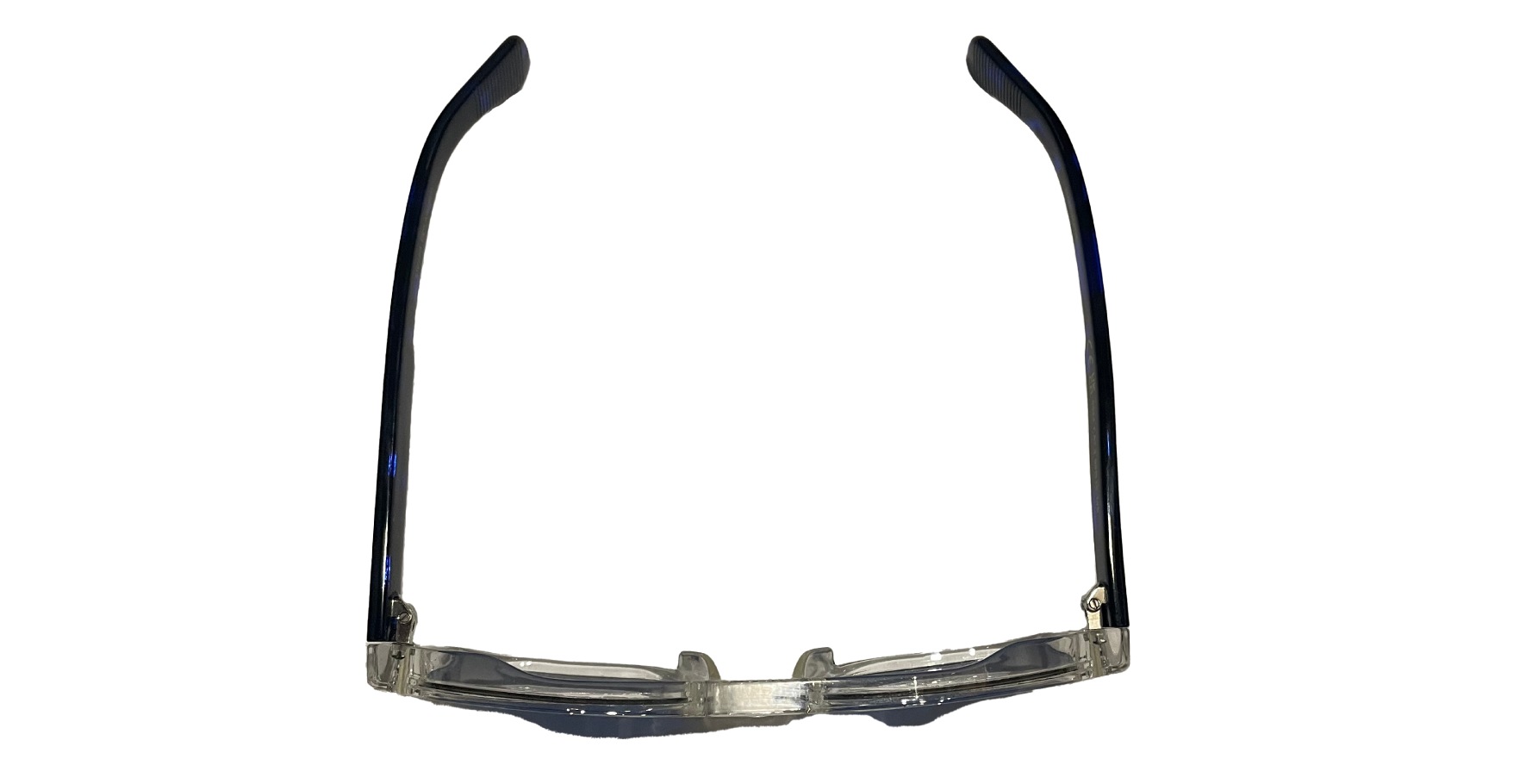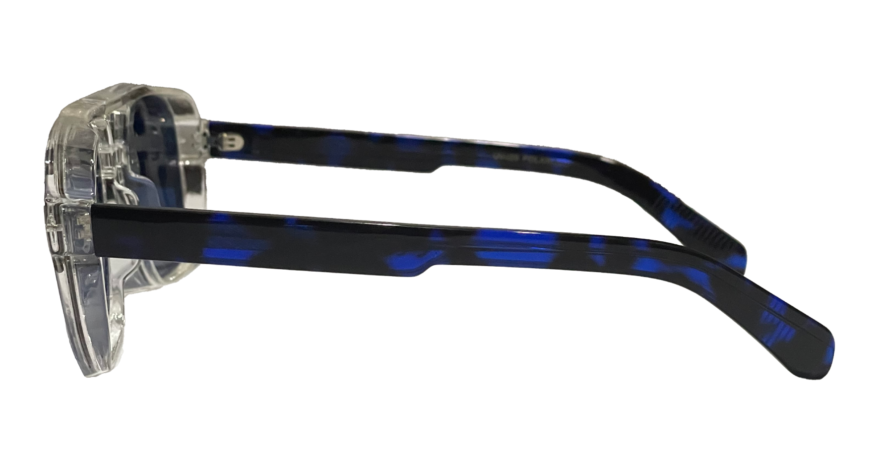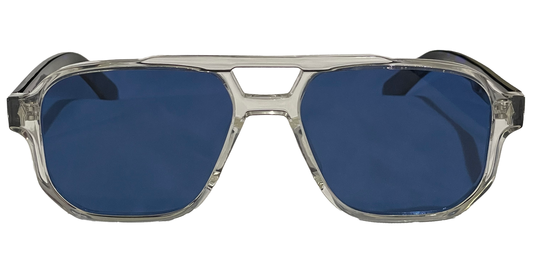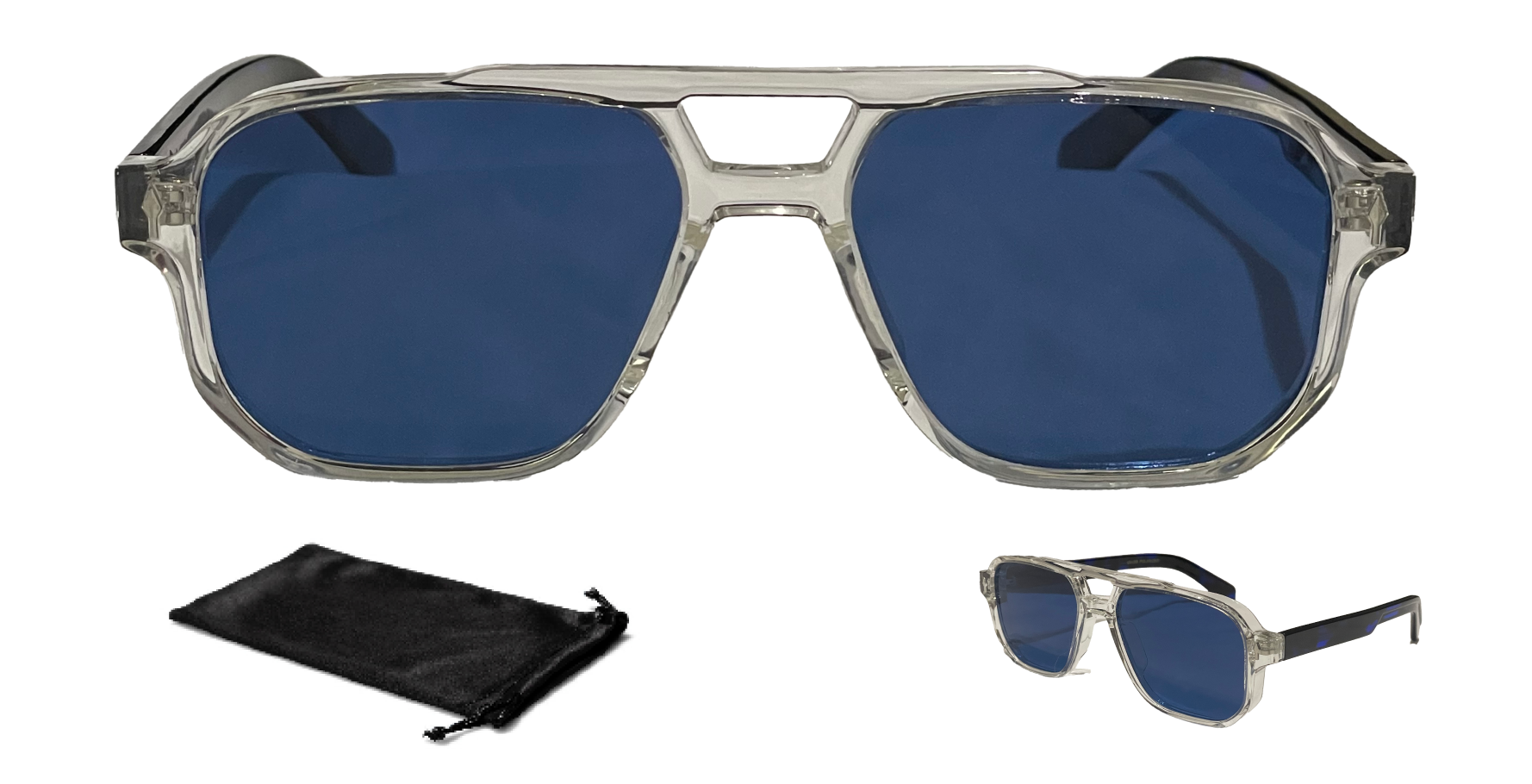 Aviators w/ clear frame, blue lenses, blue tortoise shell arms. This pair comes with a soft microfiber pouch with a double drawstring closure that also acts as a lens cleaner when necessary.