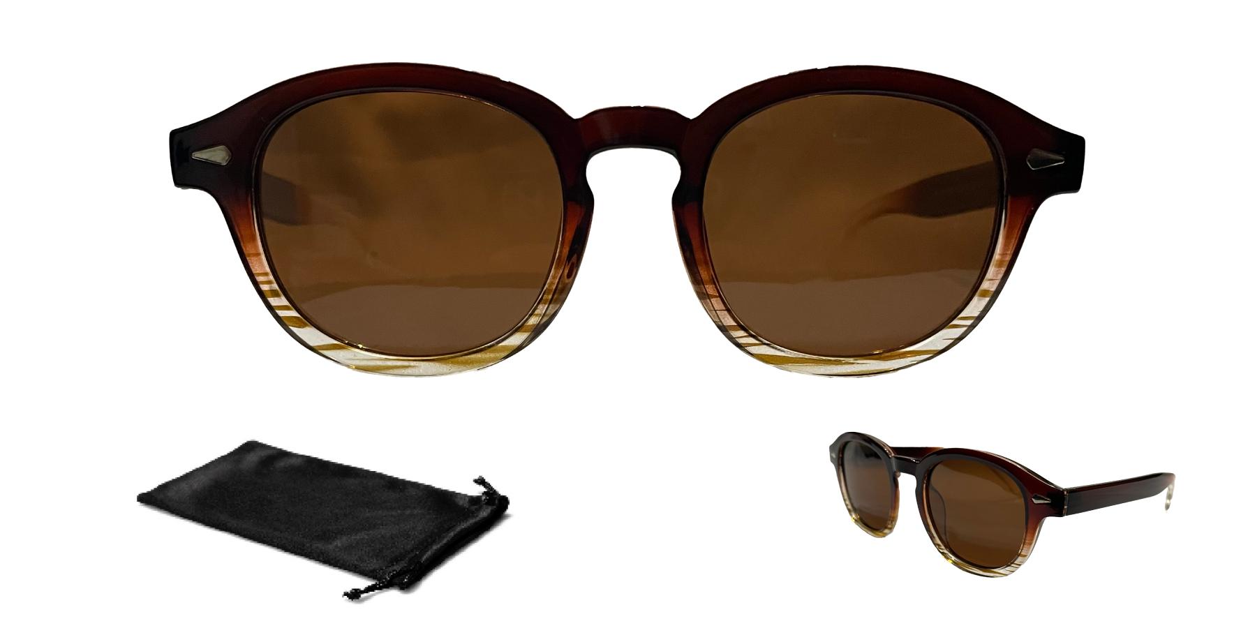 Wayframe w/ brown frame, brown lenses, brown/clear arms. This pair comes with a soft microfiber pouch with a double drawstring closure that also acts as a lens cleaner when necessary.