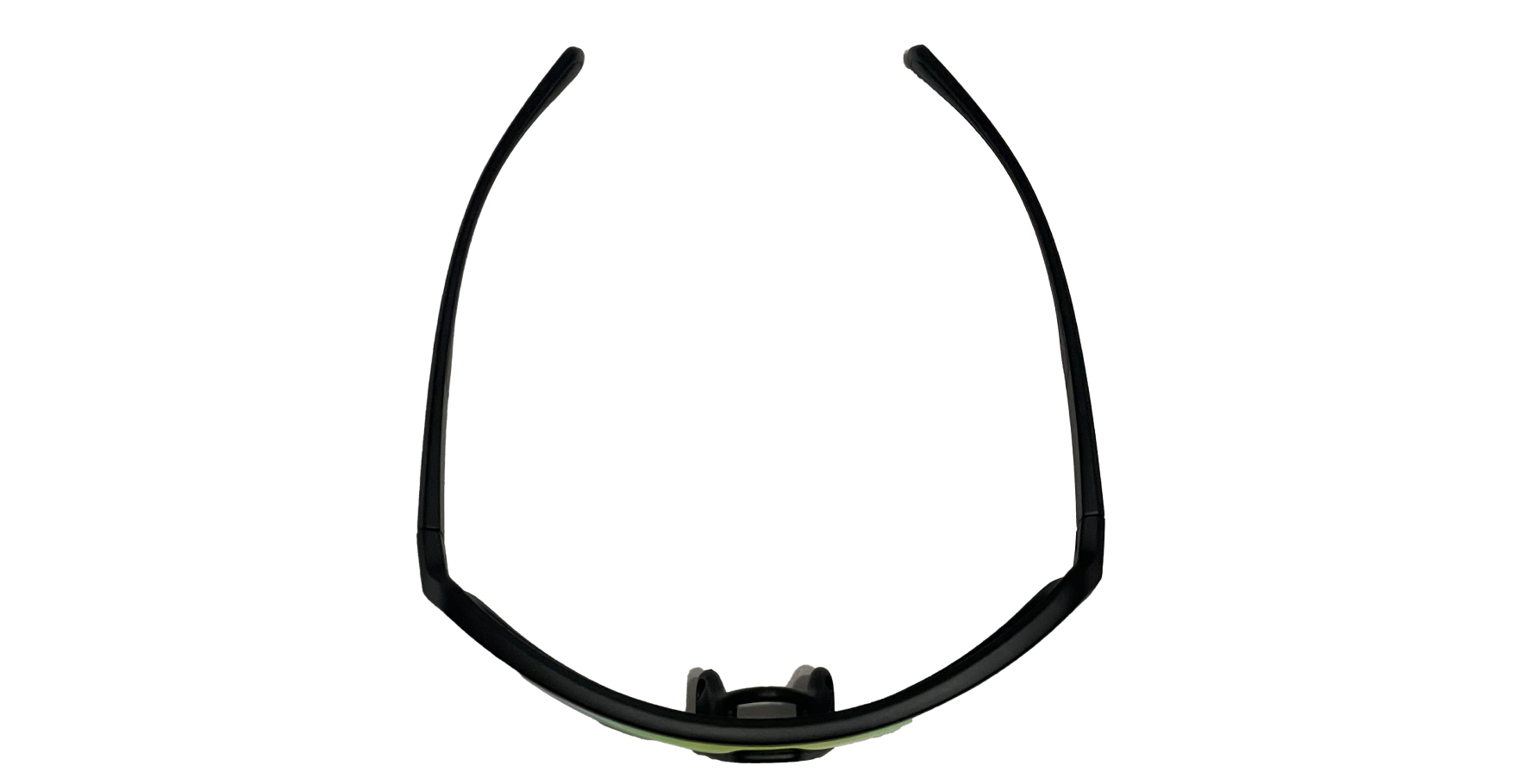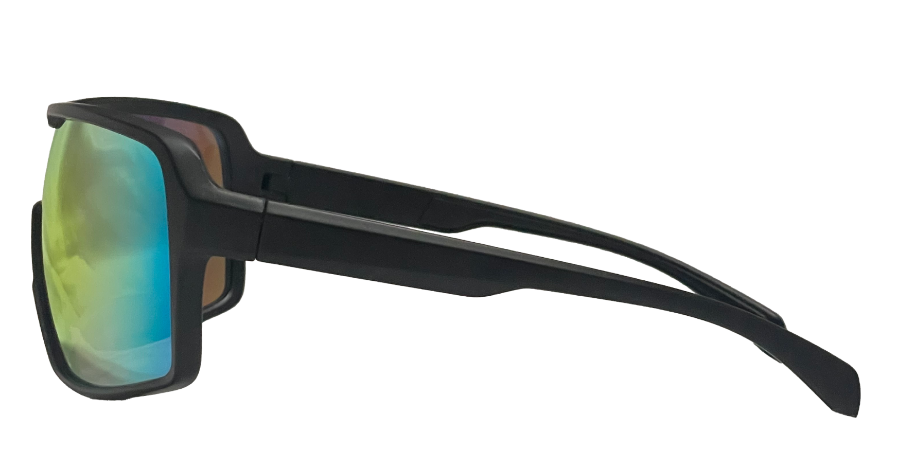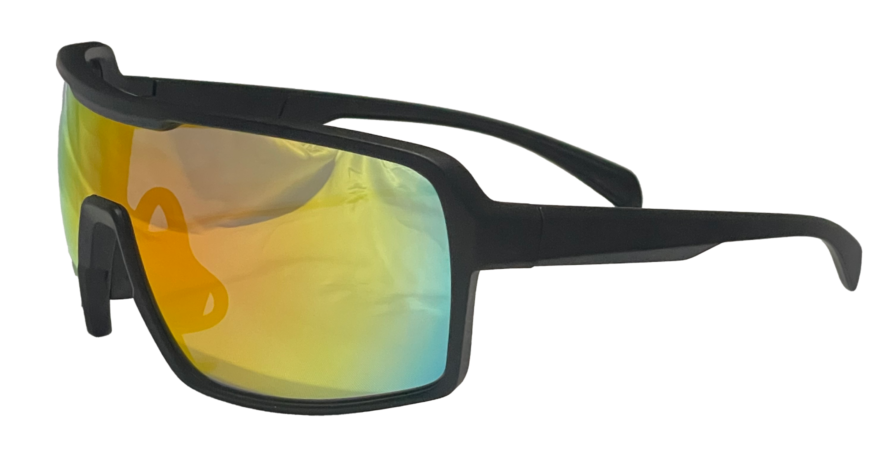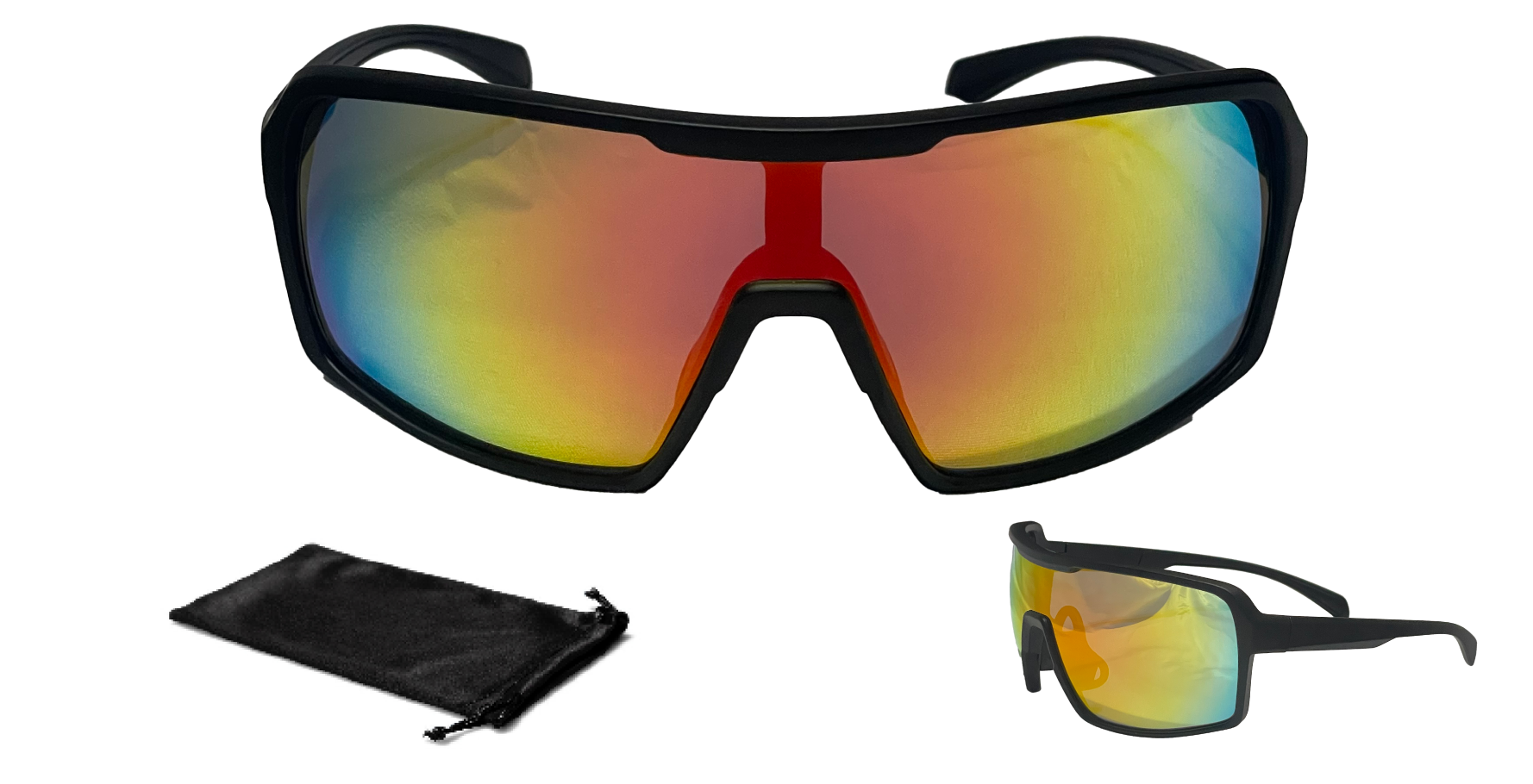 Shield frame w/ black frame and arms, multi-color gradient lens. This pair comes with a soft microfiber pouch with a double drawstring closure that also acts as a lens cleaner when necessary.