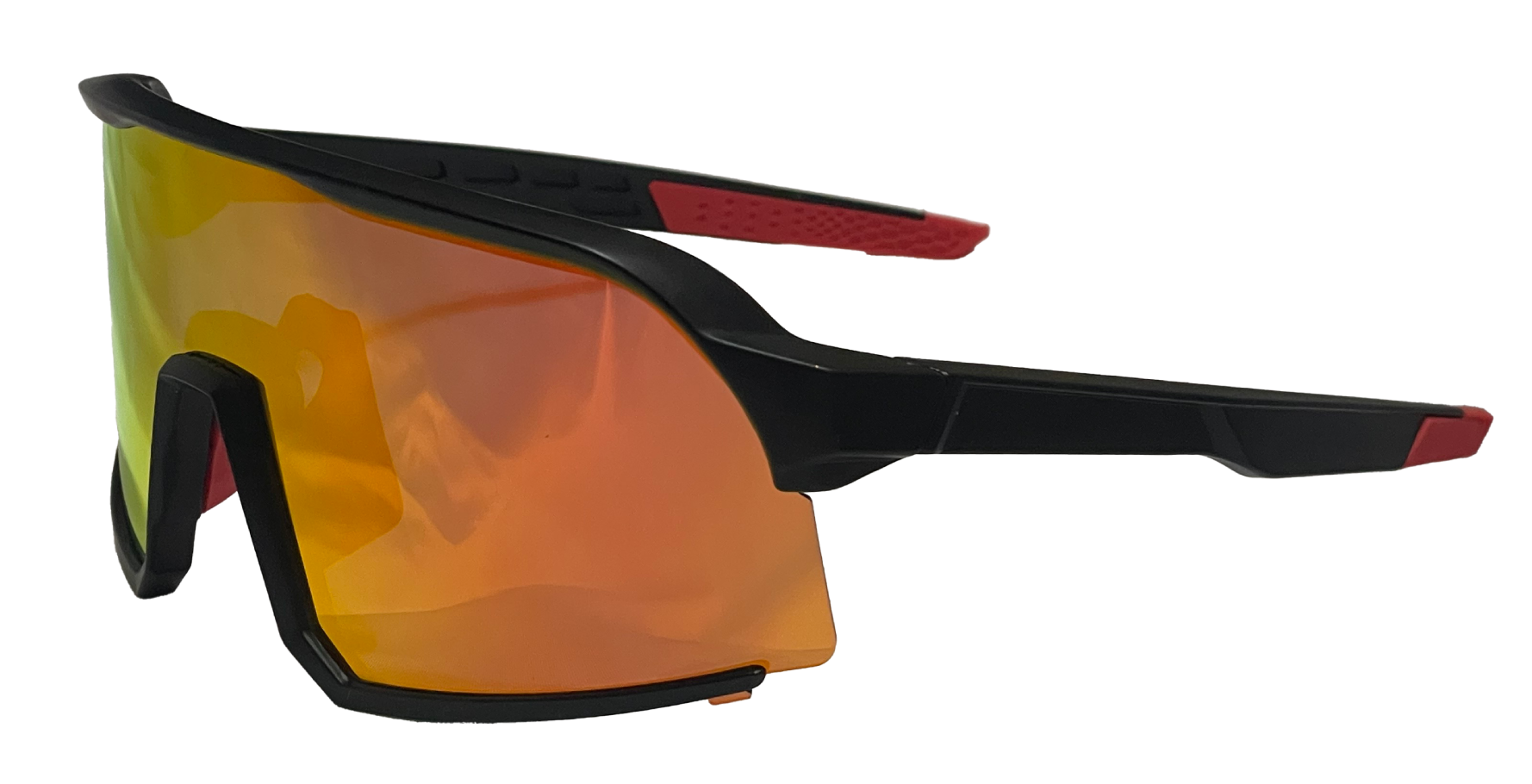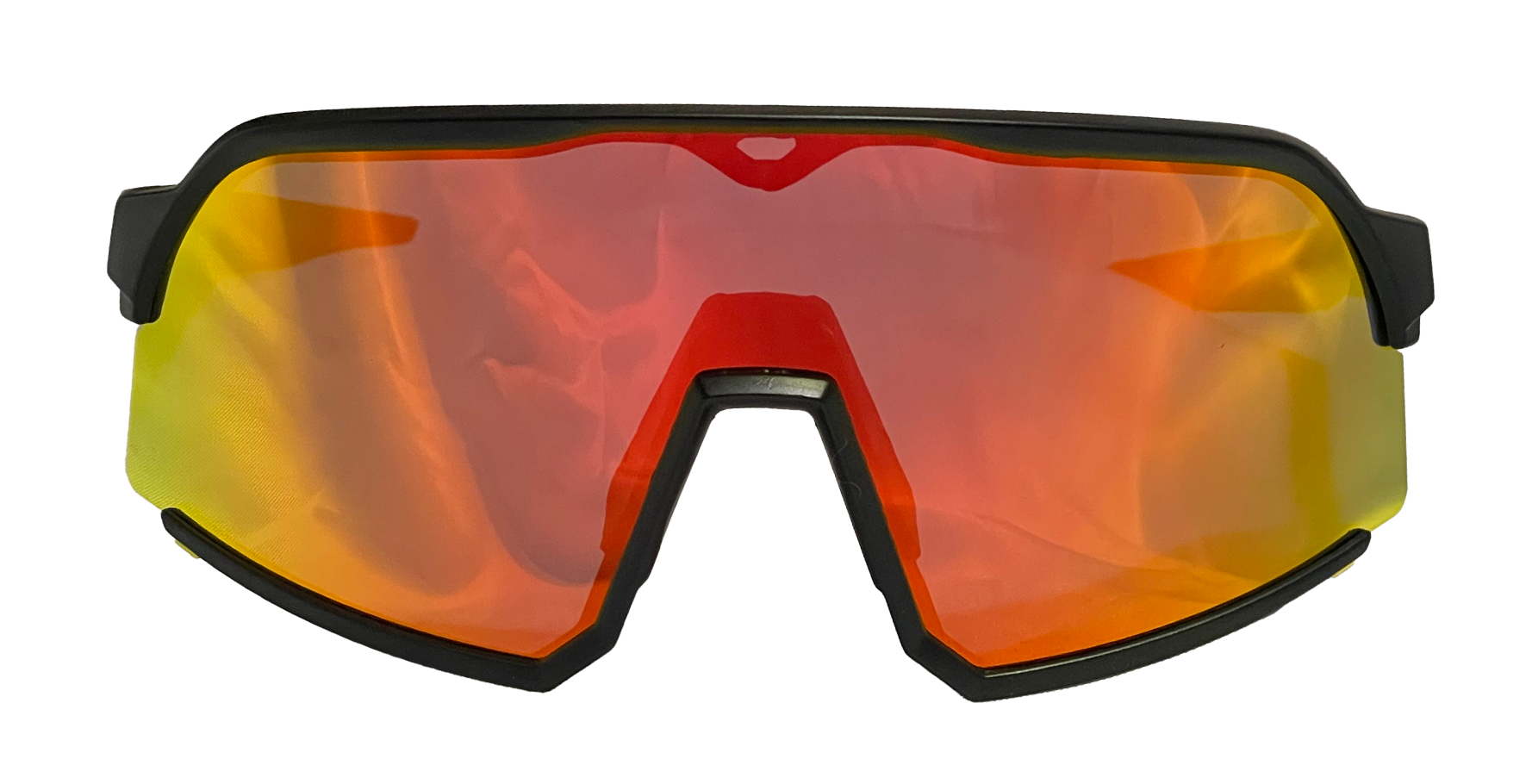 Shield frame w/ black frame and arms, orange/yellow gradient lens. This pair comes with a soft microfiber pouch with a double drawstring closure that also acts as a lens cleaner when necessary.