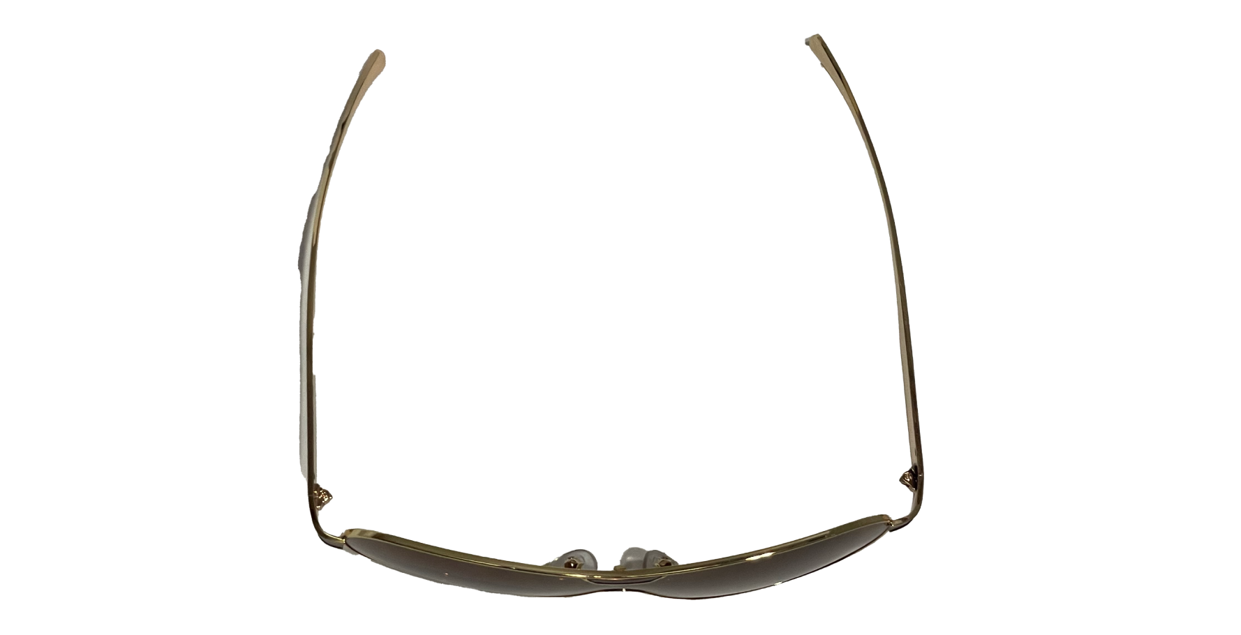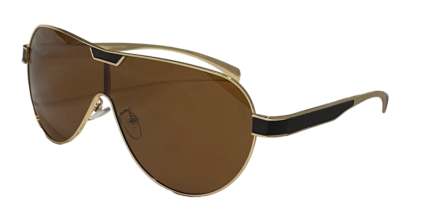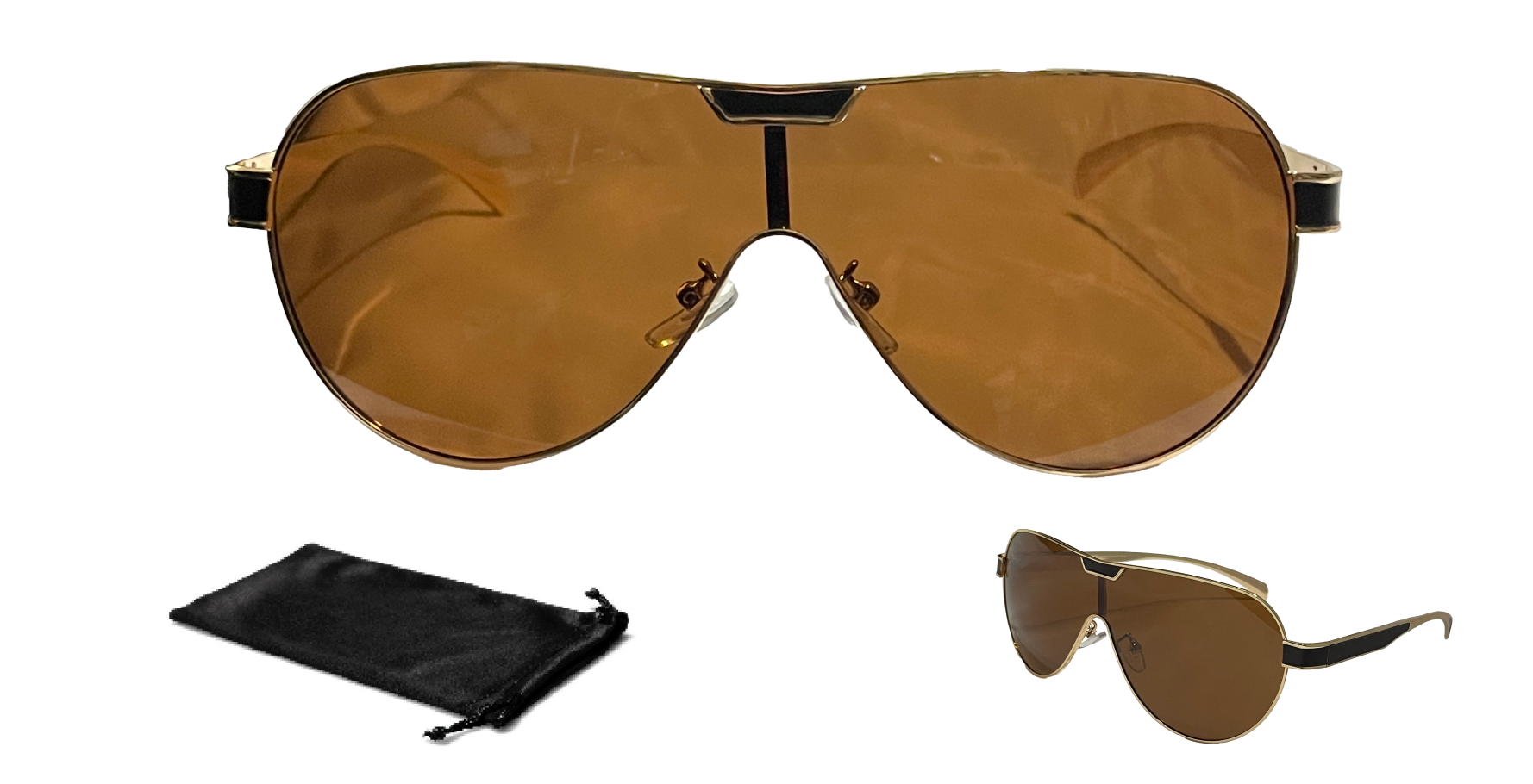 Shield frame w/ gold frame and arms, black accent, brown lens. This pair comes with a soft microfiber pouch with a double drawstring closure that also acts as a lens cleaner when necessary.