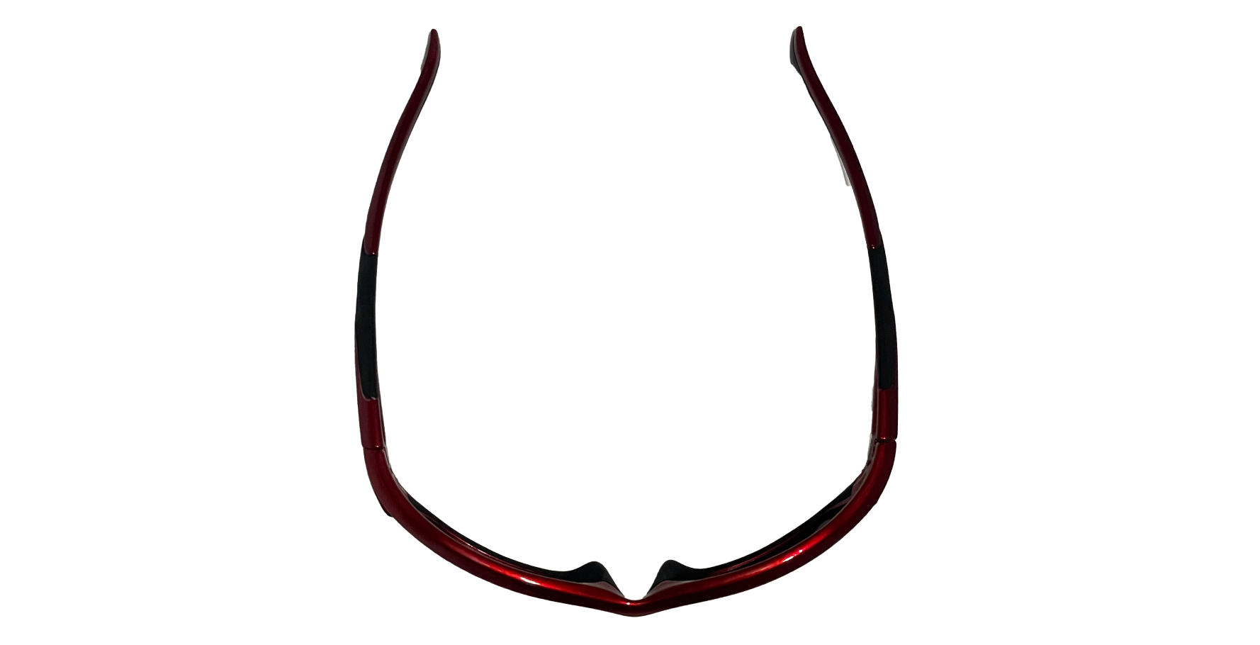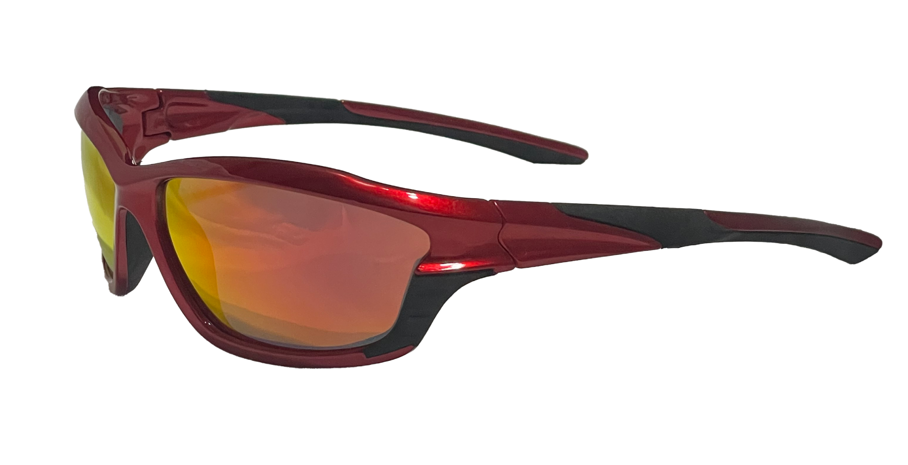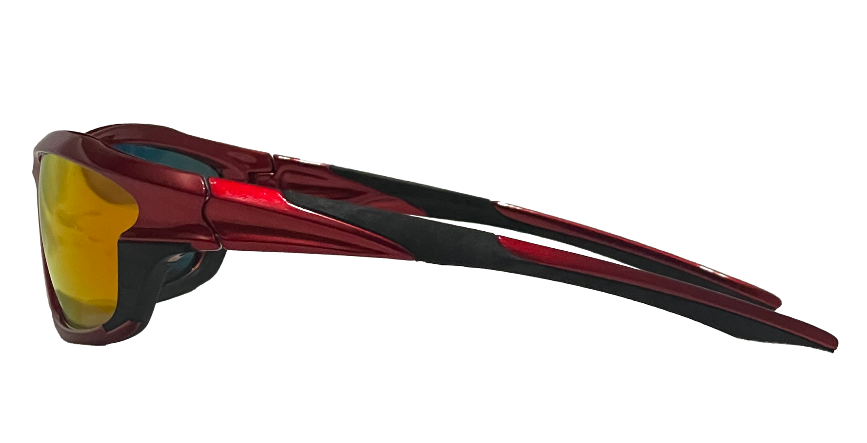 Wrap-around frame w/ red frame and arms, black accents, orange/yellow gradient lenses. This pair comes with a soft microfiber pouch with a double drawstring closure that also acts as a lens cleaner when necessary.