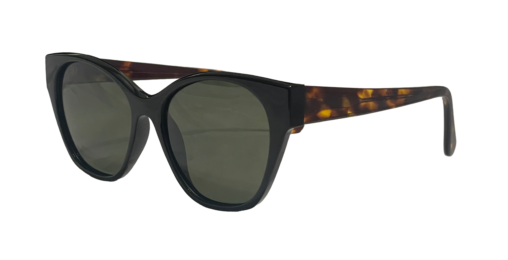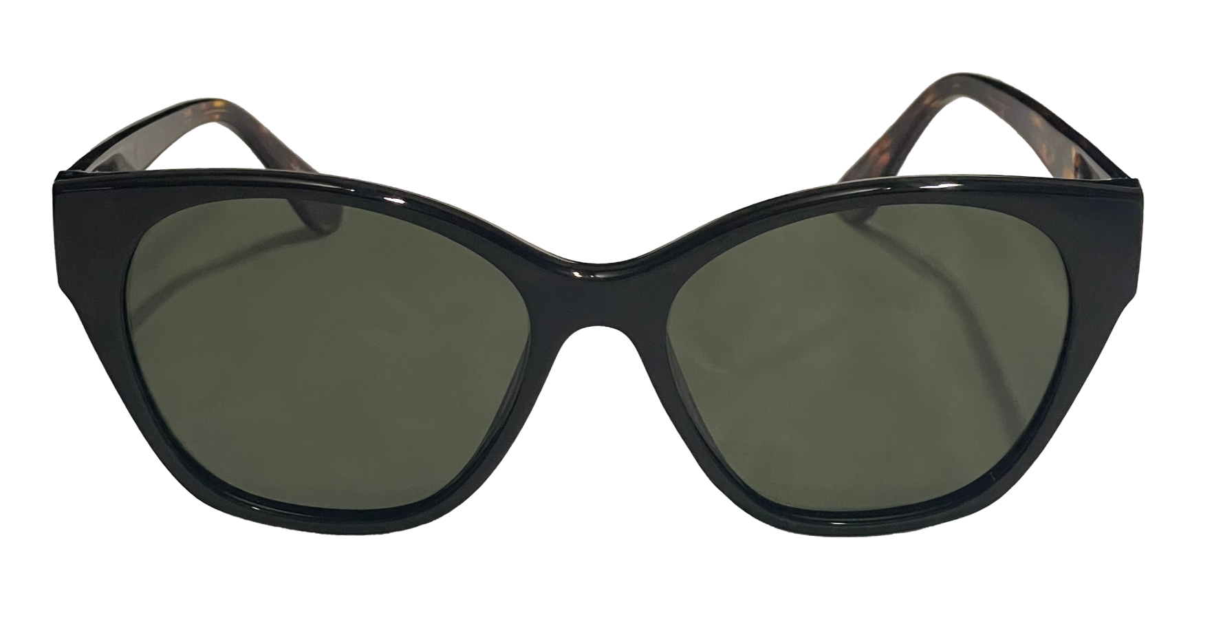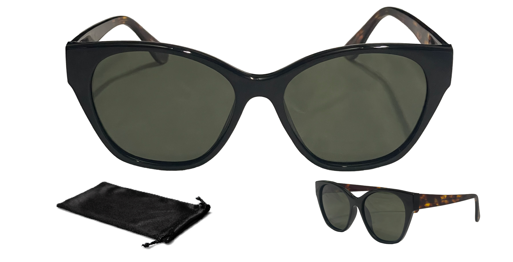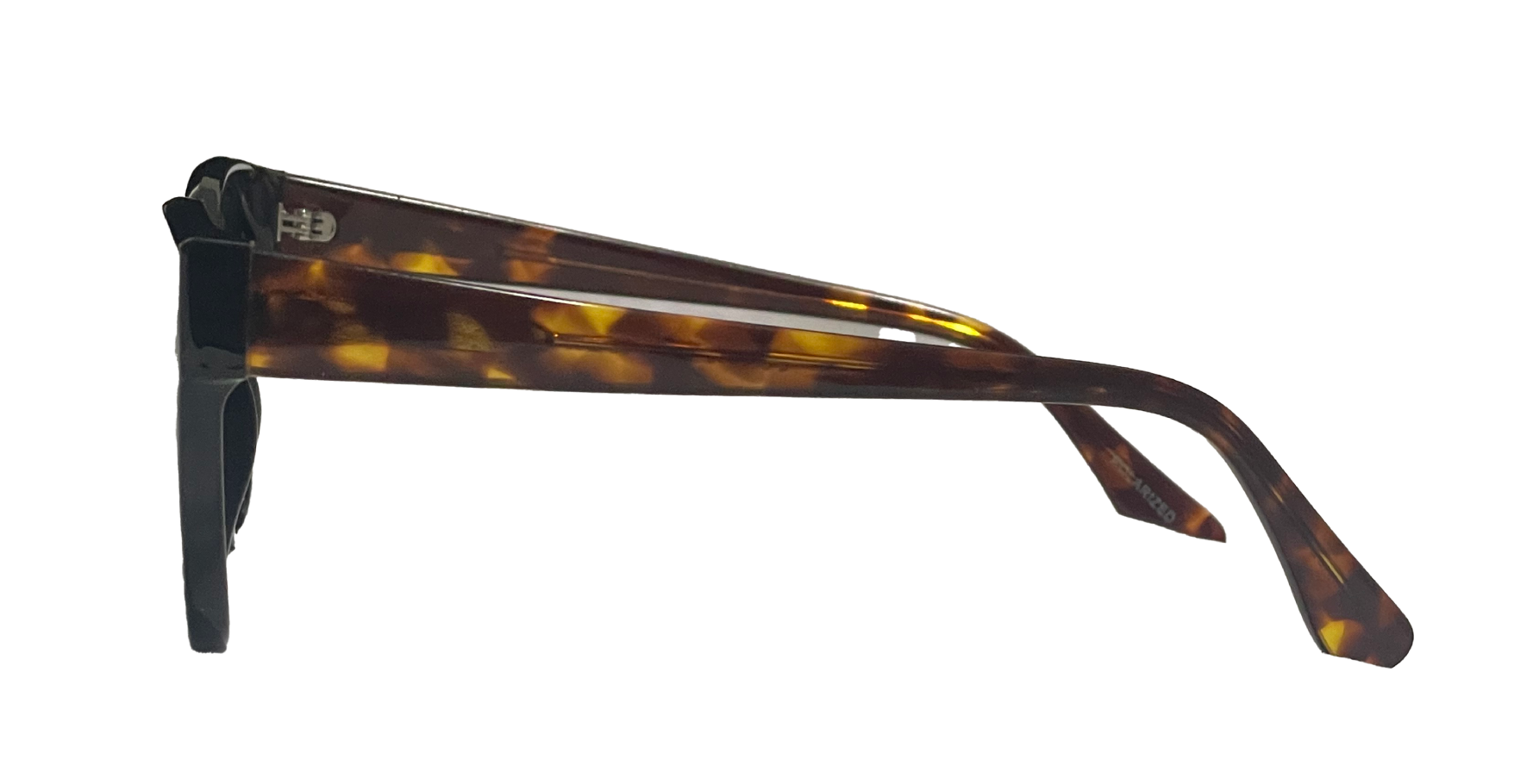 Wayframe w/ black frame, black lenses, tortoise shell arms. This pair comes with a soft microfiber pouch with a double drawstring closure that also acts as a lens cleaner when necessary.